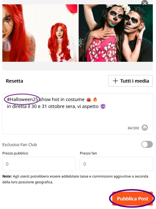 - Avant votre show, publiez sur votre Mur de profil CAM4 un post gratuit contenant une photo de vous ou une vidéo SOFT (sans montrer de parties génitales) avec votre costume sexy d’Halloween et ajoutez comme description du post : #Halloween25