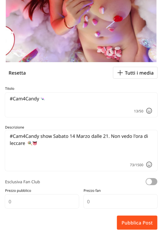 2. Prima del tuo show, pubblica sulla tua Bacheca profilo profilo CAM4 un post gratuito contenente una tua foto o un video SOFT (senza mostrare genitali) a tema sexy caramella o dolci leccate e inserisci come descrizione il tag: #Cam4Candy